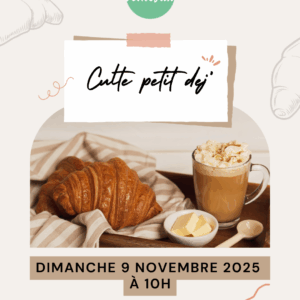 Culte petit déjeuner Culte autour d'un petit déjeuner auquel chacun peut participer au ... 09 Nov 10 h 00 min - 11 h 45 min