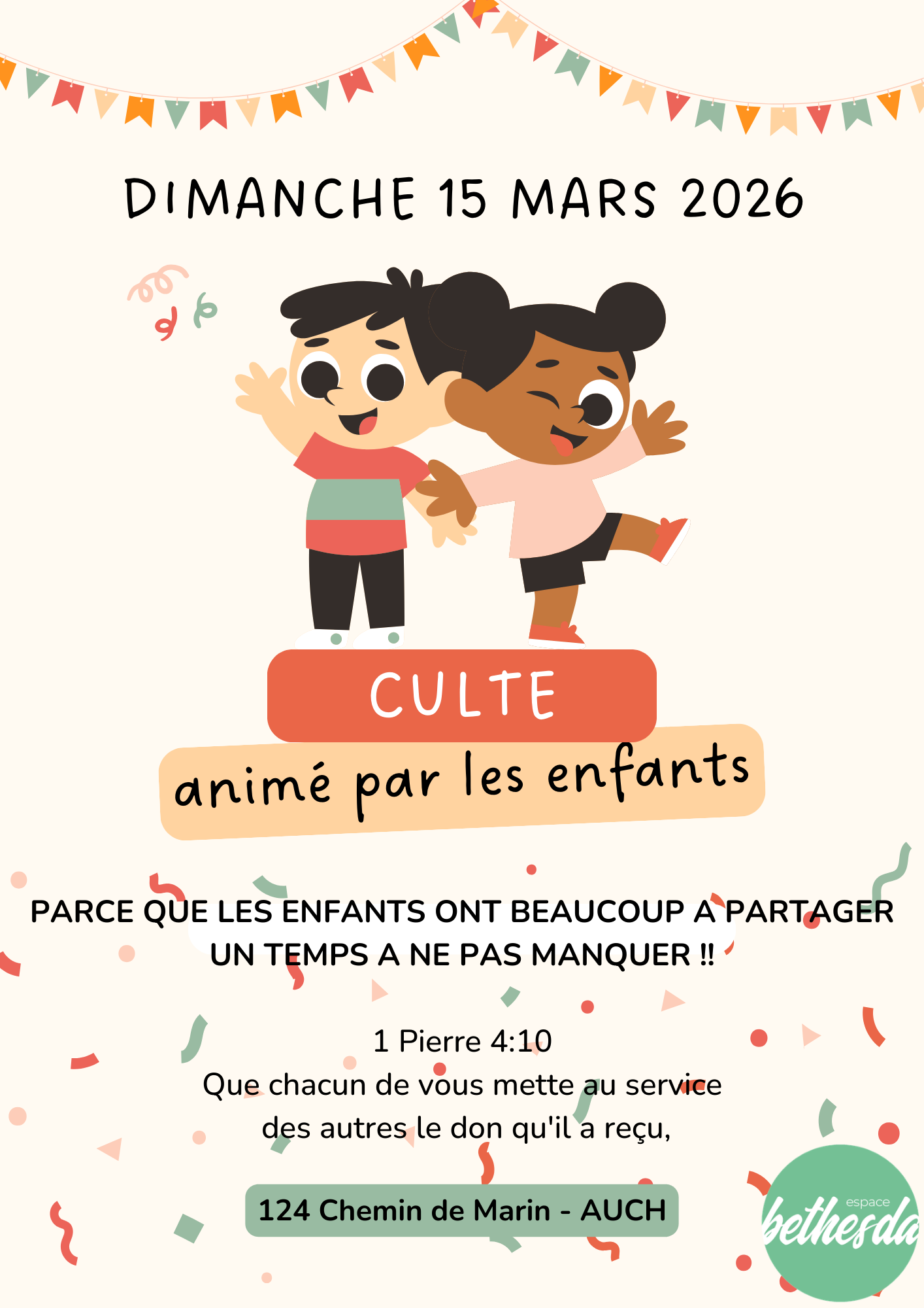 Culte animé par les enfants Un moment de culte en famille à ne pas manquer, avec la participation active des enfants ! + Ajouter à mon Agenda Google + iCal / Outlook export 00 jours 00 heures 00 minutes 00 secondes Date 15 Mar 2026 Heure 10 h 00 min - 11 h 45 min Catégorie Culte Partagez cet événement
